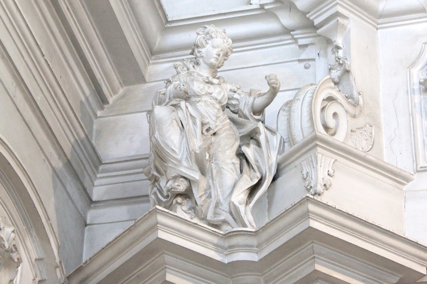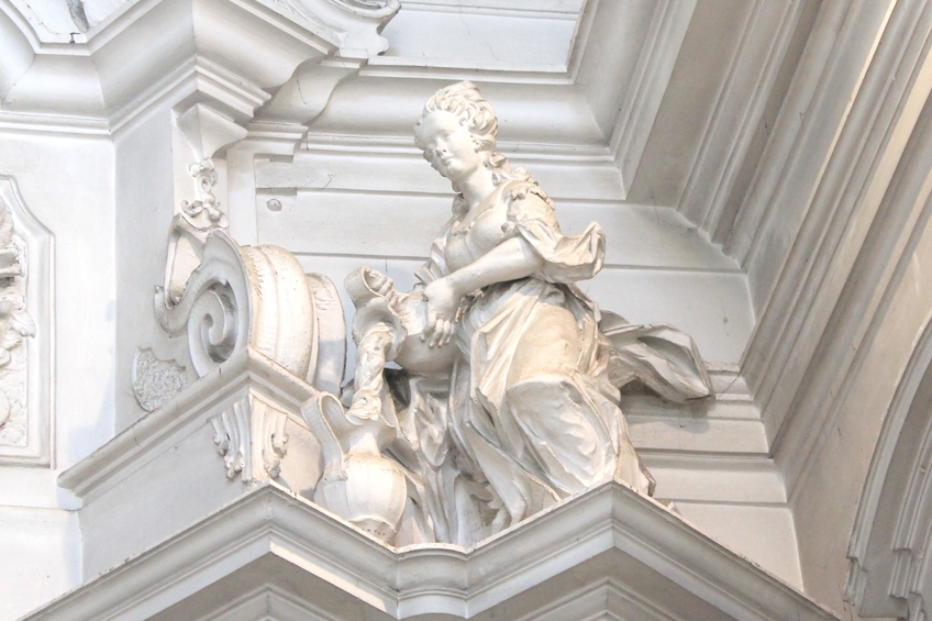 Al di sopra della trabeazione sovrastante la coppia di colonne di destra è collocata una figura femminile in stucco di ignoto scultore del XVIII secolo: è l’allegoria della virtù cardinale della temperanza.