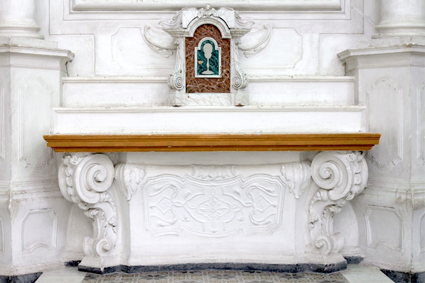 Luca identificato, qui, con i simboli iconografici della tavolozza e del pennello. La scelta è in sintonia con il tema generale dell’altare, perché, secondo un’antica leggenda, San Luca sarebbe l’autore di numerose raffigurazioni di Maria madre di Gesù.