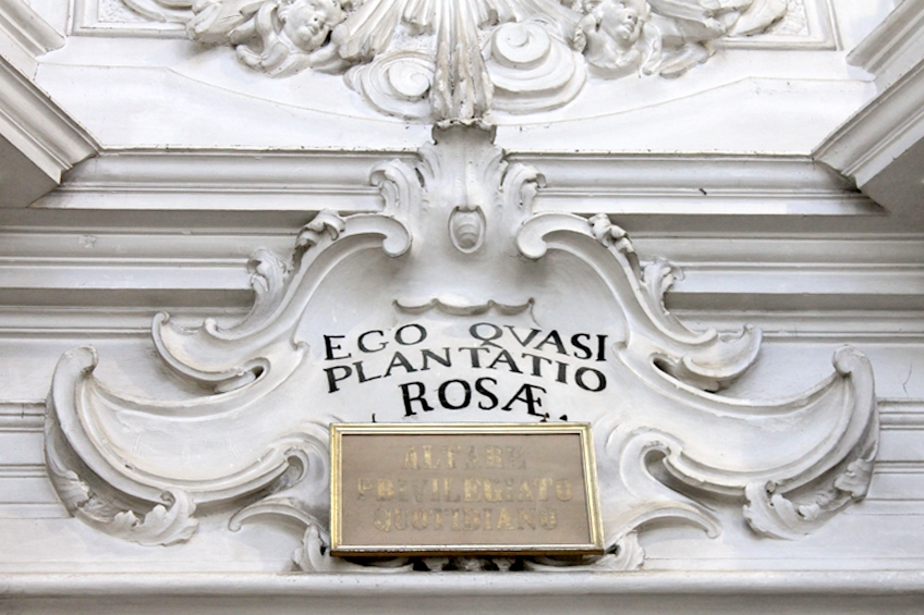II perimetro della tela è occupato da quindici riquadri ellittici, raccordati da motivi floreali, in cui sono illustrati i misteri dei rosario. Nella cornice in stucco al di sopra della pala si legge, in sintonia con il contenuto della tela, una frase del Siracide attribuita a Maria "Ego quasi plantatio rosae" (Sono cresciuta come pianta di rosa - Sir 24,14). Ii termine rosario, da rosarium (roseto), ha preso nel secolo XIII il significato mistico di corona di rose a Maria. I quindici misteri sono legati a tre momenti particolarmente significativi delia vita di Gesù e di Maria: l'infanzia di Gesù (misteri della gioia), la sua passione (misteri del dolore) e la sua vita da risorto seduto alla destra dei Padre (misteri della gloria). Giovanni Paolo II nel 2003, anno del rosario, ha integrato la preghiera con i misteri della luce, legati alla vita pubblica di Gesù.