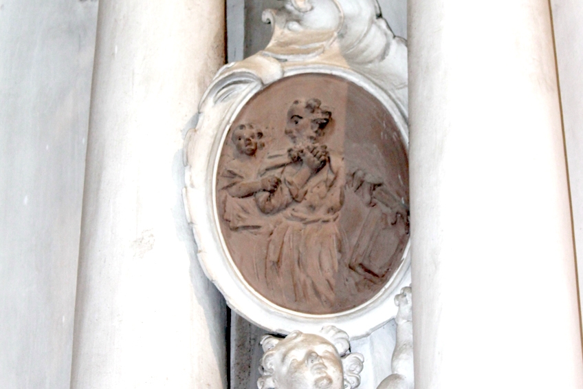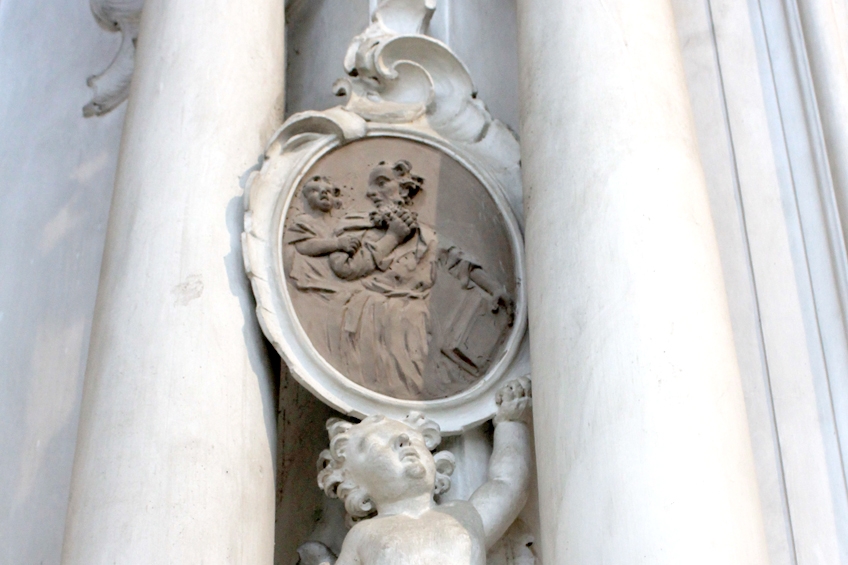 L’opera, di ignoto scultore del XVIII sec., è collocata sulla trabeazione sovrastante la coppia di colonne di sinistra.